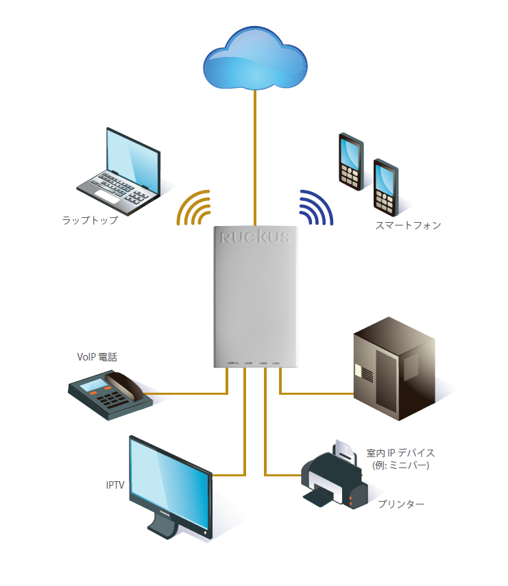 H510は、最高の柔軟性を誇り、将来に渡って使用することが可能です。将来のアドオン無線モジュールをワイヤレスでセキュアに接続できるよう設計されており、クラス最高のWiFi品質のさらに先を行きます。背面の配線用パスウェイでRG6やCAT3/CAT5などの従来の有線接続に対応します。イーサネット経由のビデオや音声など既存のサービスも同じジャンクションボックスで同時に提供できるため、導入時間と工事費用の両方を短縮できます。H510はスタンドアロンデバイスとして、またはSmartZone、ZoneDirector、FlexMaster のいずれかの管理プラットフォームにより集中管理することが可能です。