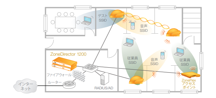 ZoneDirector 1200はどのレイヤー2/3ネットワーク内にも配備できます。Ruckus ZoneFlex APは、ZoneDirectorによって自動的にプロビジョニングされます。